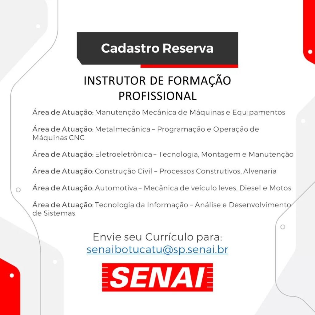O Serviço Nacional da Indústria (Senai) abriu cadastro reserva para professores em sua unidade de Botucatu.