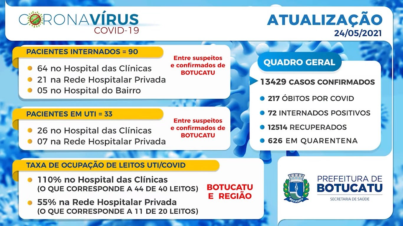 Além disso, há 90 pacientes internados para tratamento médico, sendo que 64 estão no Hospital das Clínicas de Botucatu, 21 na rede privada de saúde e cinco no Hospital do Bairro. Desse total, 72 pessoas têm diagnósticos positivos ao novo coronavírus.