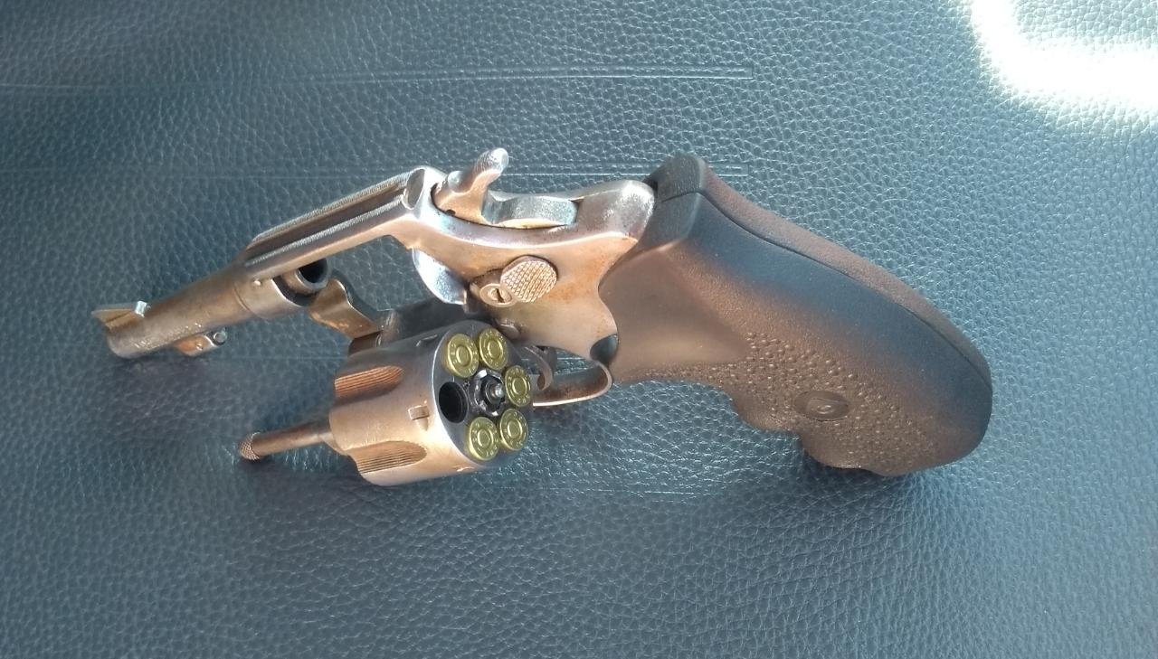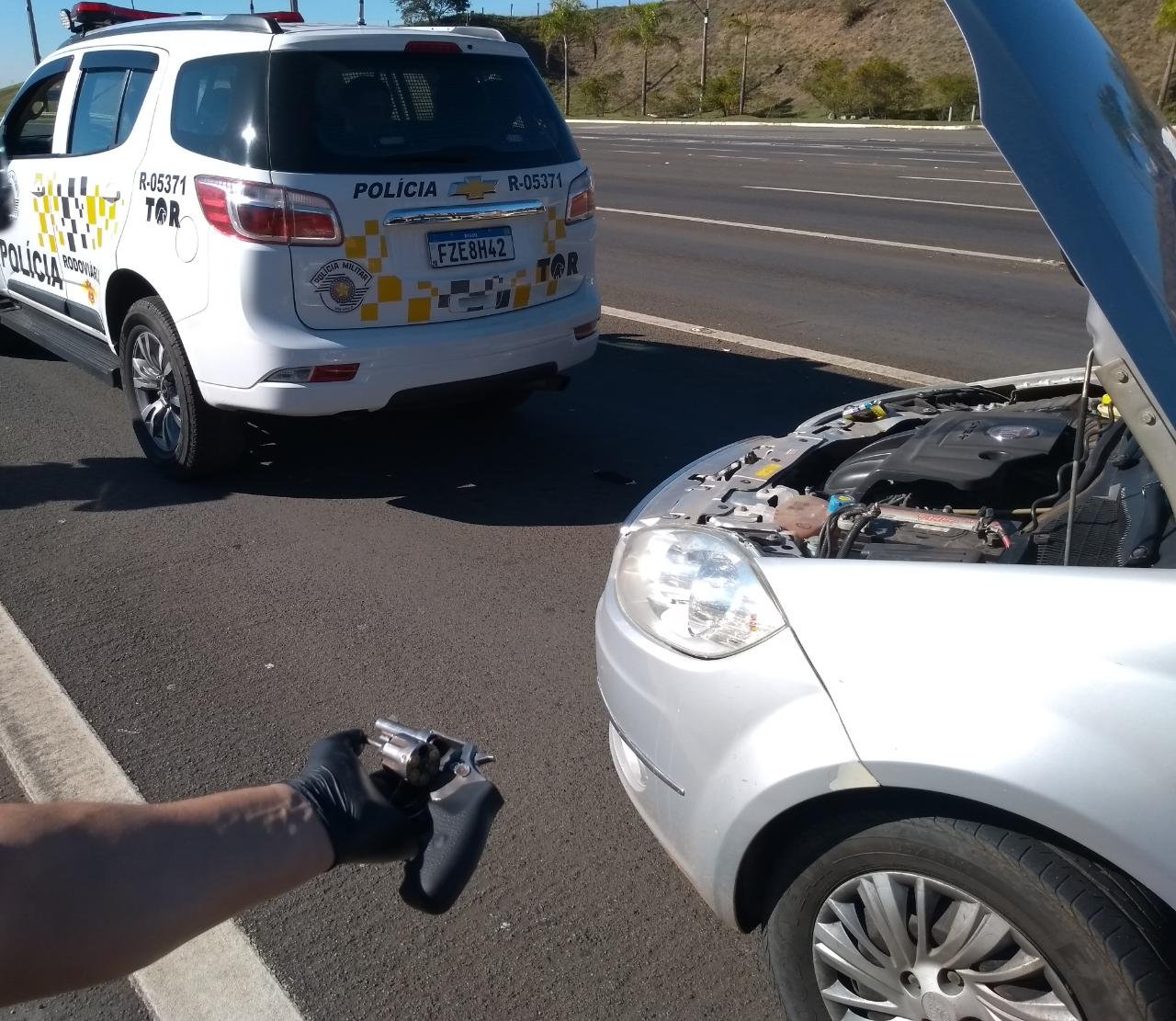 Dentro da revista foram localizados, embaixo do banco do motorista, um revolver da marca TAURUS, calibre 32, carregado com 05 (cinco) munições íntegras, além de localizarem também, numa sacola que estava no assoalho do banco dianteiro, aos pés do passageiro, um documento de registro e licenciamento (CRLV) de um semirreboque com placas de Duartina (SP), cartões bancários e documentos pessoais em nome do proprietário do semirreboque.