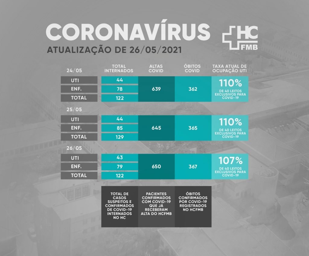 A enfermaria concentra 79 pacientes sob cuidados médicos. Ao todo, o HCFMB possui 122 pessoas internadas para tratamento do novo coronavírus. Desde o início da pandemia, o HCFMB- que recebe pacientes de todo o interior paulista-, ocorreram 650 altas hospitalares e 367 mortes.
