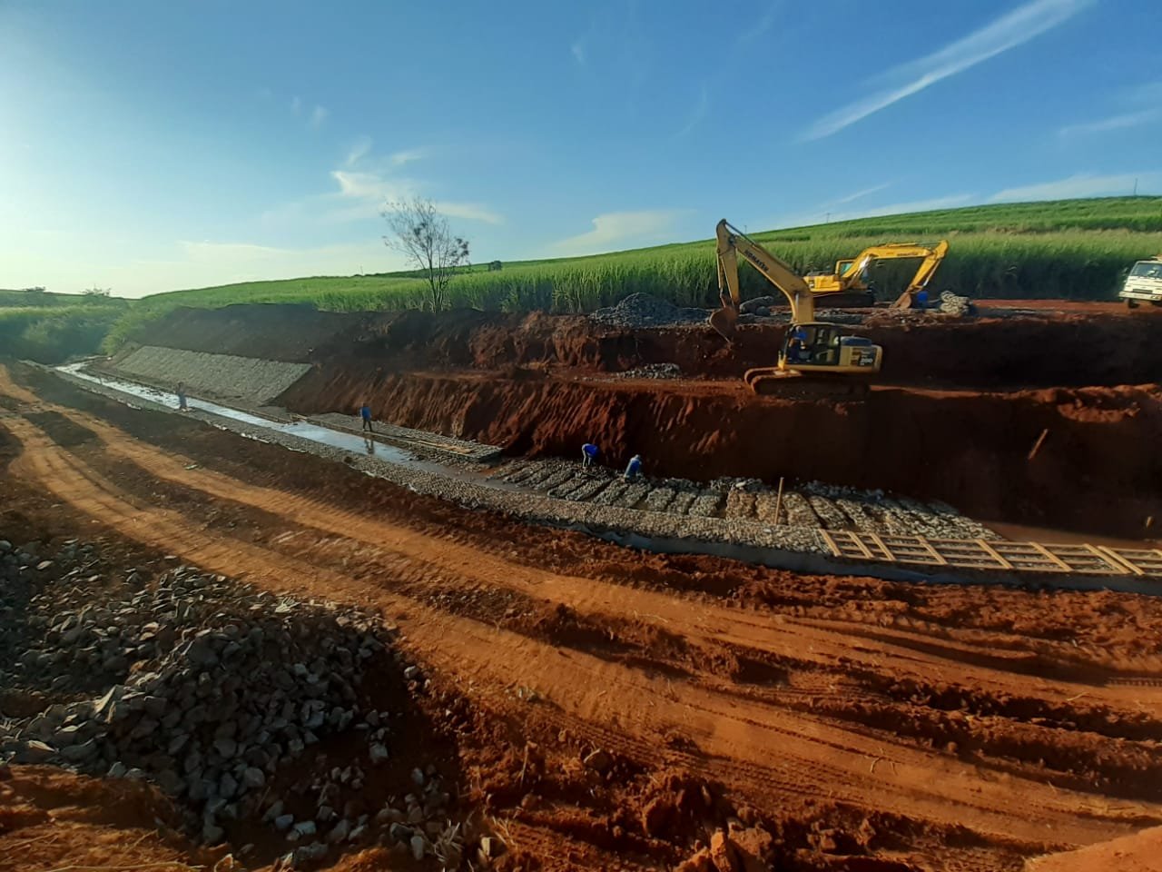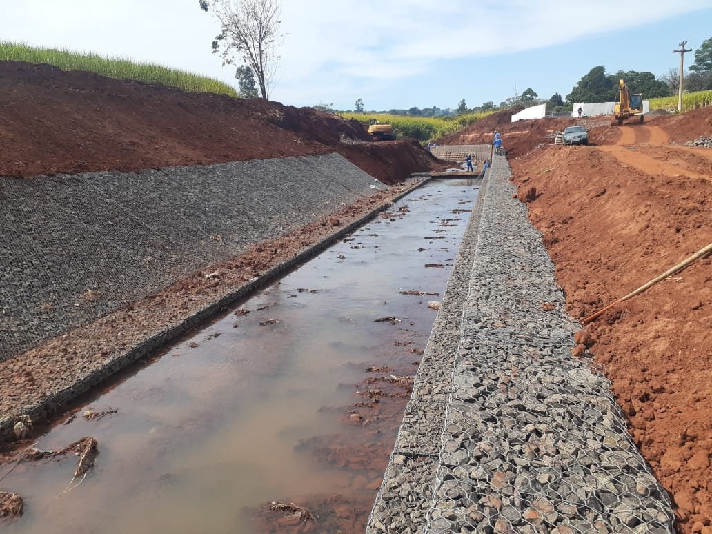 As obras, que tiveram início em abril 2021, incluem a reconstrução de 70 metros de emissários final de esgoto, a construção de 220 metros de muro de gabião nas duas margens do córrego, o serviço de reaterro com a execução de talude compactado que serve como base de sustentação para garantir a estabilidade do solo e também para correção das erosões, além dos serviços de urbanização e drenagem da área.