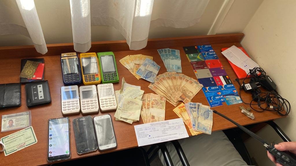 Com o paradeiro informado, a polícia entrou no hotel junto com o filho da vítima que reconheceu o carro usado pelos golpistas. Com conhecimento da gerência e flagrou os três acusados. No quarto foram apreendidos diversos cartões das vítimas, seis máquinas de cartões, notas fiscais de compras, comprovantes de pedágios, três aparelhos celulares (sendo um objeto de furto), três crachás falsos da Febraban, três porções de maconha e R$ 2.182 em notas falsas.
