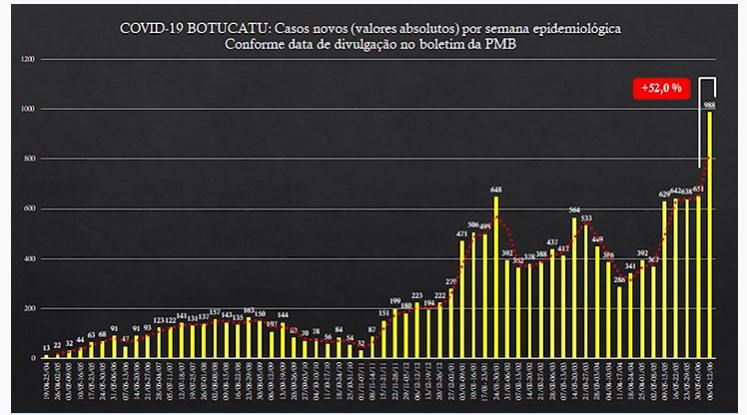 A incidência de novos casos de Covid-19 em Botucatu voltou a superar todas as demais semanas epidemiológicas. Foram registrados 988 novos casos entre 6 e 12 de junho, conforme divulgado pela Secretaria Municipal de Saúde. O valor representa aumento de 52% do período anterior e é o maior de toda a pandemia, iniciada em março de 2020.