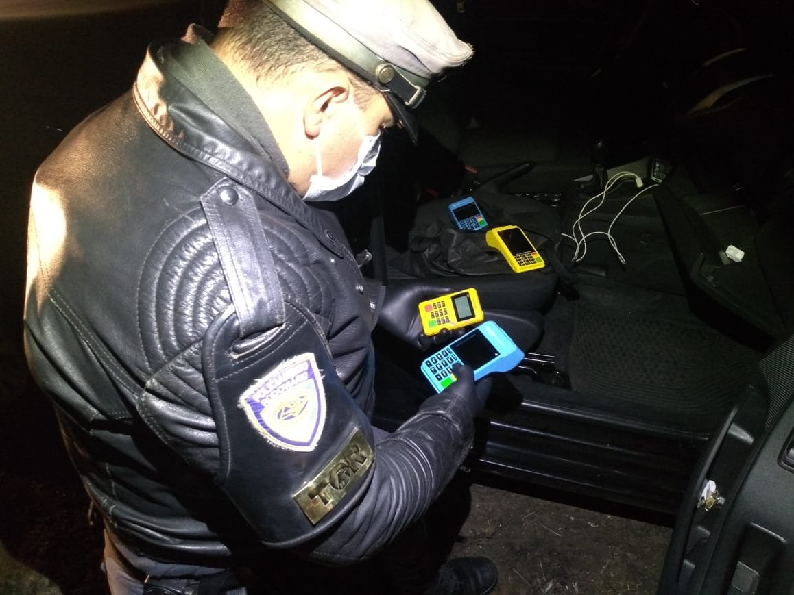 Ao ser realizada a busca veicular, os policiais militares rodoviários localizaram no interior do automóvel, 4 máquinas de crédito/débito, sendo duas delas encontradas no assoalho embaixo do banco do passageiro e outras numa sacola, além e R$ 1.600,00 em espécie dentro da mochila do condutor.