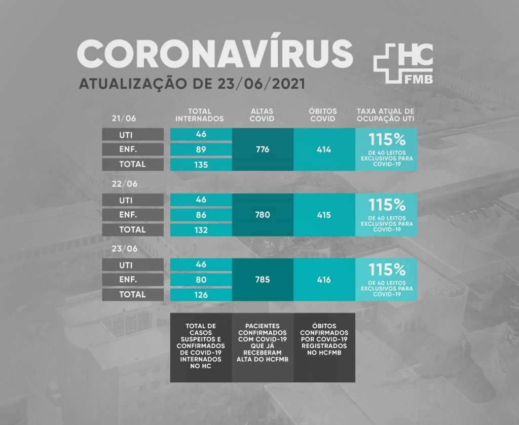 O Hospital das Clínicas de Botucatu registra nesta quarta-feira, 23 de junho, 115% de ocupação em leitos de terapia intensiva (UTI) exclusivos para a Covid-19. Com isso, todos os 40 leitos estão em uso, sendo necessário a abertura de mais seis espaços extras.