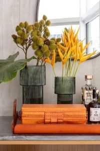 Cinéfilos que são [os três pets do casal Tarantino, Martin (Scorsese) e Tim (Burton) levam o nome de cineastas famosos], Thaila e Renato costumam passar bastante tempo na sala de estar assistindo TV ou jogando videogame – um dos passatempos preferidos deles. Ali, o verde musgo é protagonista em itens de mobiliário como o sofá e, para acompanhar, surge também na nossa seleção de almofadas. Já o mix de mesas de centro feitas a partir de diferentes materiais dá um toque original ao ambiente, além de acomodar uma seleção criteriosa de coffee table books de arte. Na área do lounge bar, quem ganha destaque é a cristaleira Muca, criação exclusiva da Westwing Collection, companhia ideal para as poltronas Tube amarelas, feitas para acomodar os convidados com muito estilo e conforto.