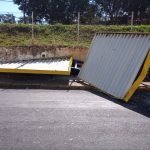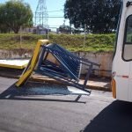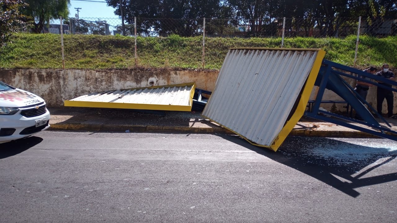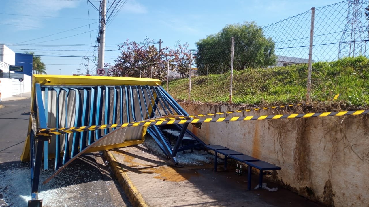 Um ônibus da Stadtbus que faz o transporte urbano em Botucatu enroscou no teto e veio a danificar o abrigo destinado a usuários do sistema.