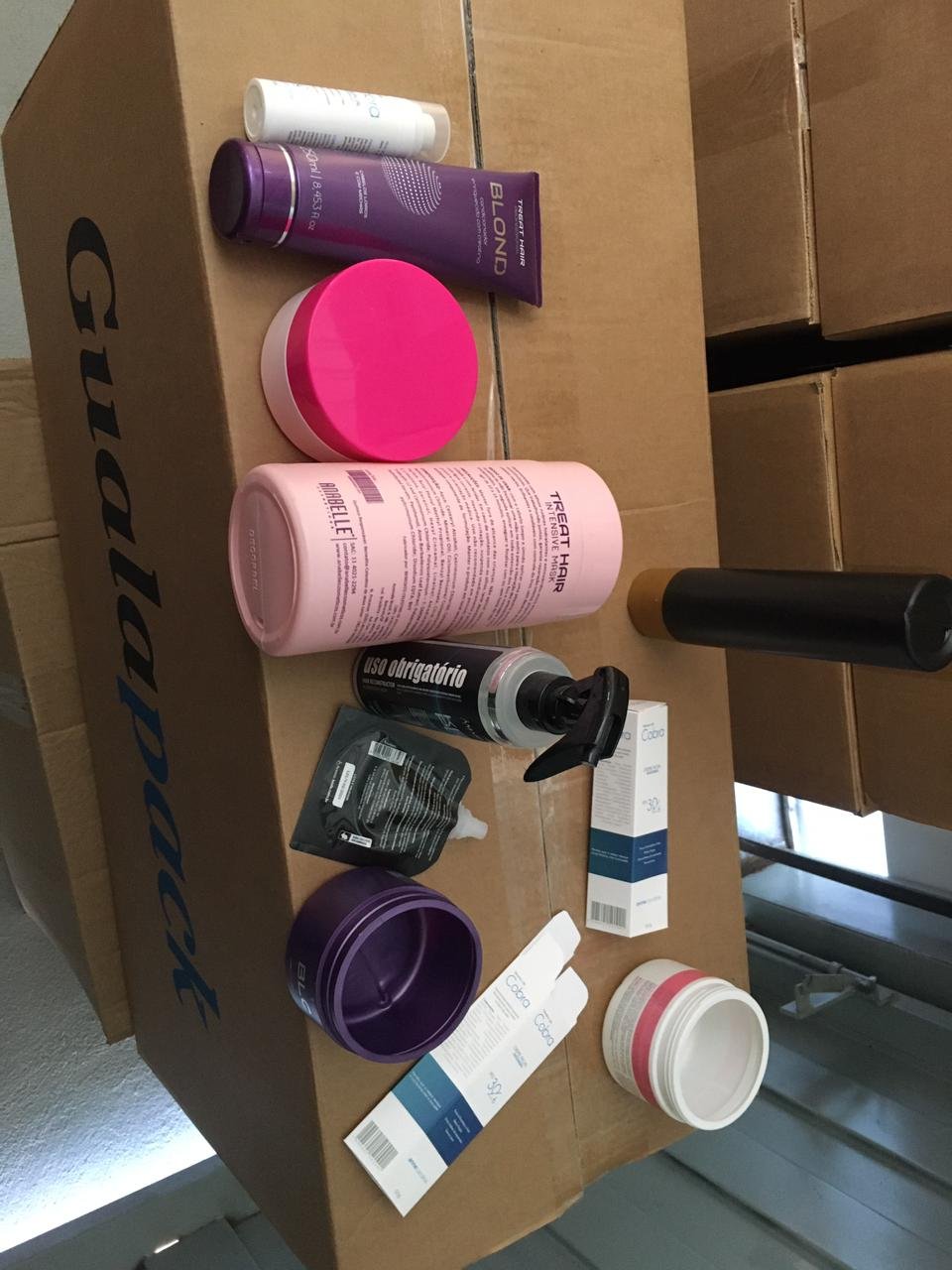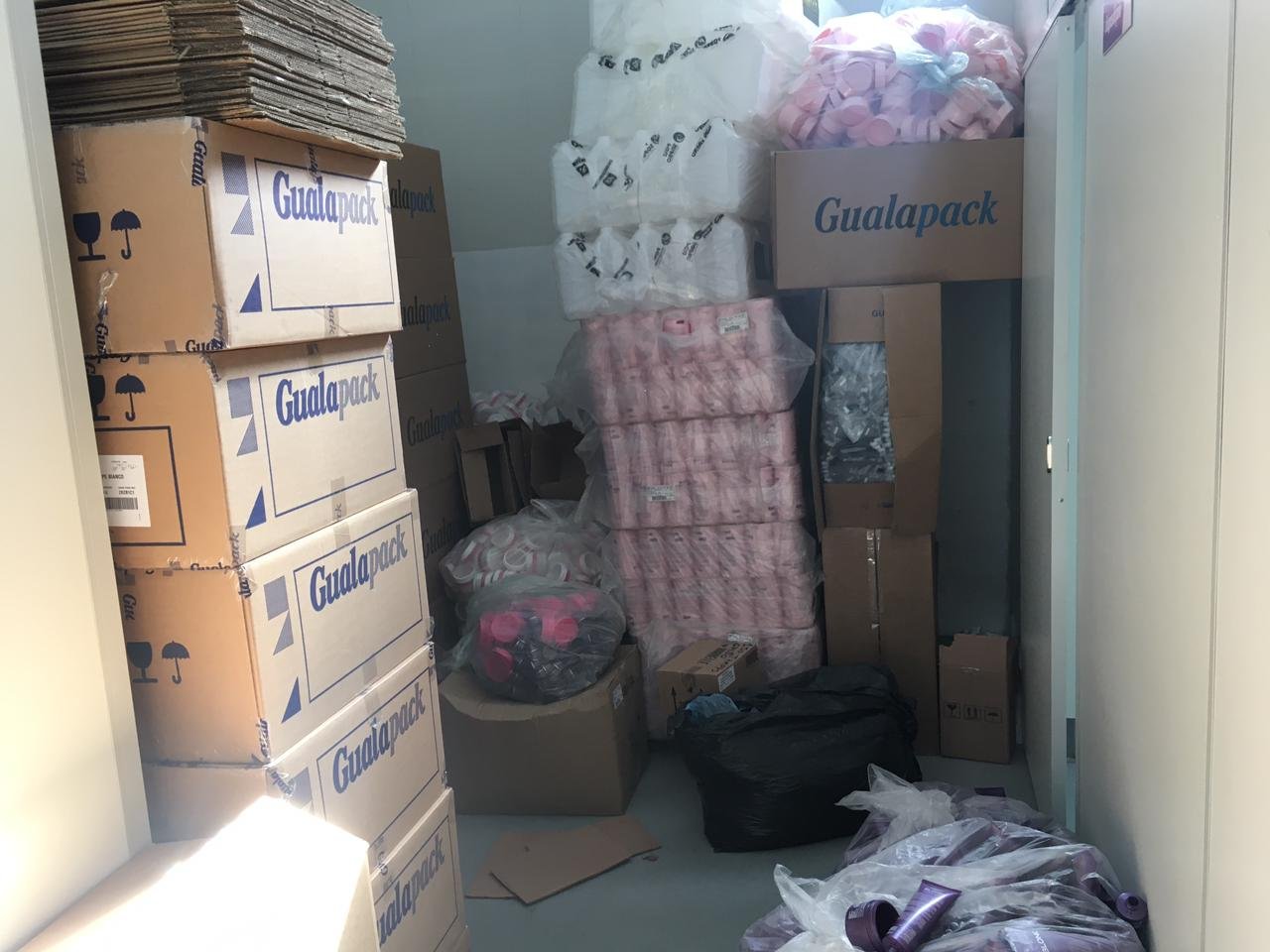 Ao todo, foram localizados cinco rolos de etiquetas de diversos produtos, 2.650 embalagens de produtos capilares, 56 mil embalagens e 60 mil tampas de máscaras faciais, além de uma máquina envasadora e uma máquina rotuladeira.