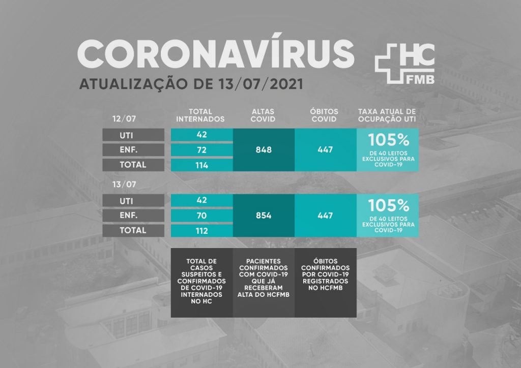 A enfermaria concentra 70 pacientes sob cuidados médicos. Ao todo, o HCFMB possui 112 pessoas internadas para tratamento do novo coronavírus. Desde o início da pandemia ocorreram 854 altas hospitalar e 447 mortes, na unidade que recebe pessoas de todo o interior paulista.