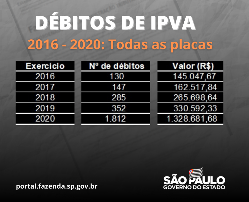 Para mais informações, os proprietários dos veículos podem entrar em contato com a Secretaria da Fazenda pelo canal Fale Conosco, no portal.fazenda.sp.gov.br ou nos telefones do Call-Center 0800 0170 110 (chamadas de telefone fixo) e (11) 2450-6810 (exclusivo para chamadas de celular).