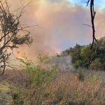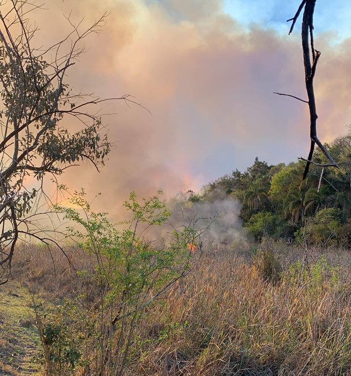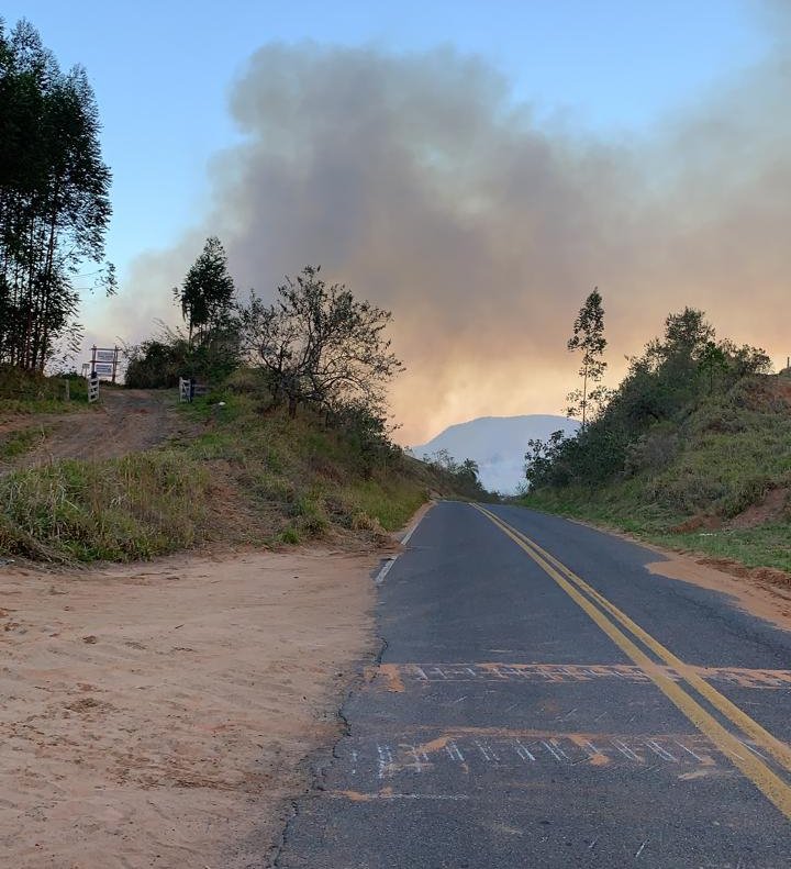 Incêndio, que teve início no meio da tarde desta segunda-feira, 6 de setembro, consumiu grande área e prejudicou a visibilidade na Rodovia Lázaro Cordeiro de Campos.