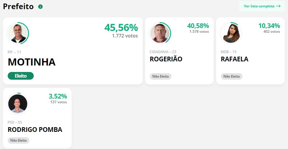 Mais de 5.800 eleitores estavam aptos a votar, sendo que 3.889 votos foram considerados válidos. As urnas estavam 100% apuradas às 19 horas. Motinha, como é conhecido, recebeu 1.772 votos (45,56%) contra 1.578 do segundo colocado, Rogerião (Cidania). Rafaela (MDB)  obteve 402 votos (10,34%) e Rodrigo Pomba (PSD), 137 votos (3,52%). Ainda foram contabilizados 52 votos em branco (1,30%) e 63 nulos (1,57%)