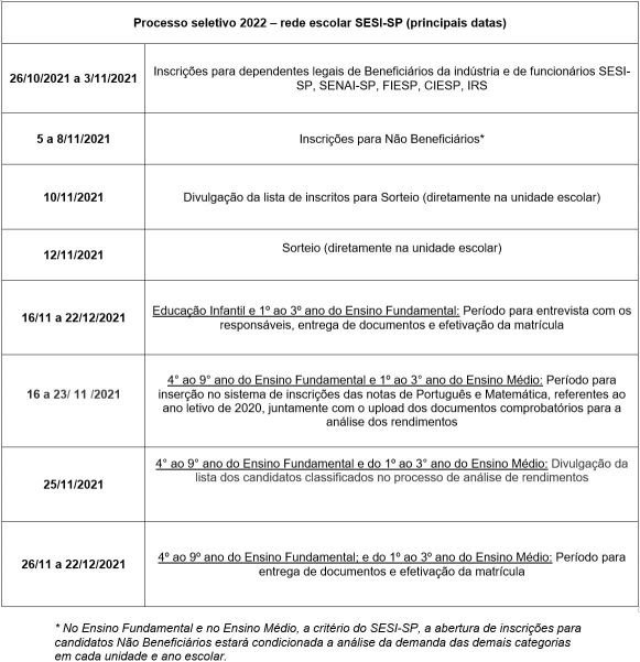 A partir das 8 horas da manhã do dia 26 de outubro de 2021 estarão abertas as inscrições para os interessados em matricular seus filhos na rede escolar SESI-SP de todo o Estado, para o ano letivo de 2022. As vagas são para a Educação Infantil e os Ensinos Fundamental e Médio. O cadastro deve ser feito exclusivamente online, pelo site do Sesi-SP, a partir da data de início do processo seletivo.