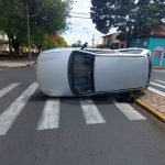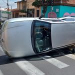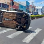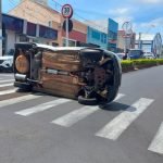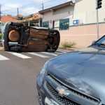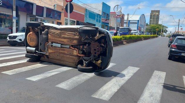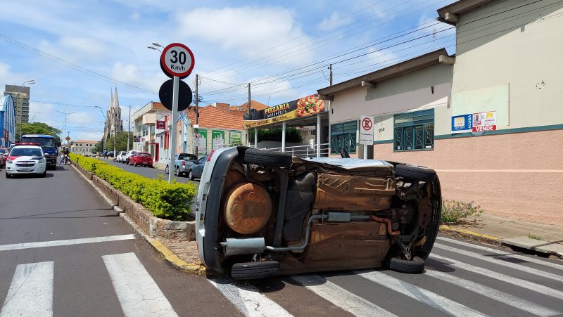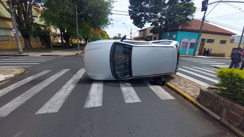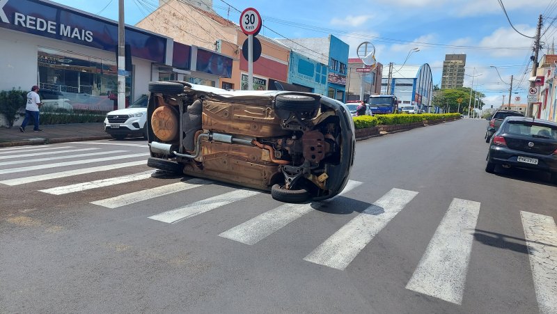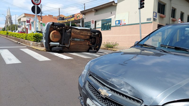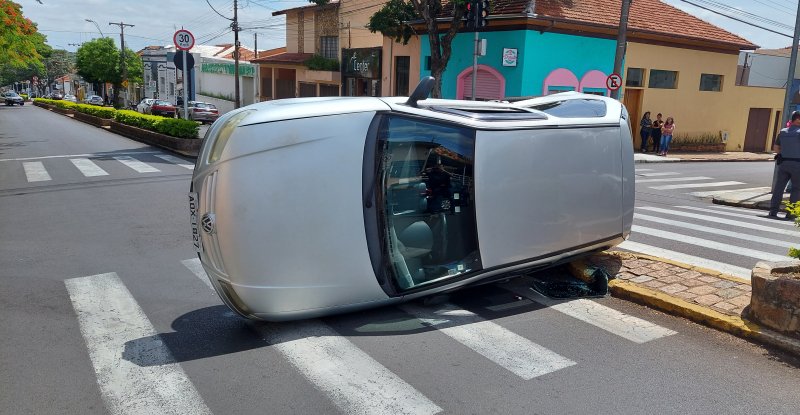 Um Volkswagen Gol tombou após colisão com um Chevrolet Celta no cruzamento das Avenida Santana com a Rua Coronel Fonseca, no Centro de Botucatu.