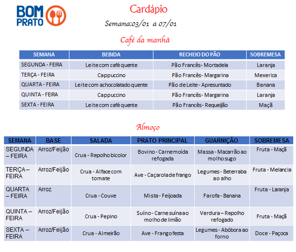 O Bom Prato Botucatu divulgou nesta segunda-feira, 3 de janeiro, o cardápio semanal do restaurante para a primeira semana do ano.