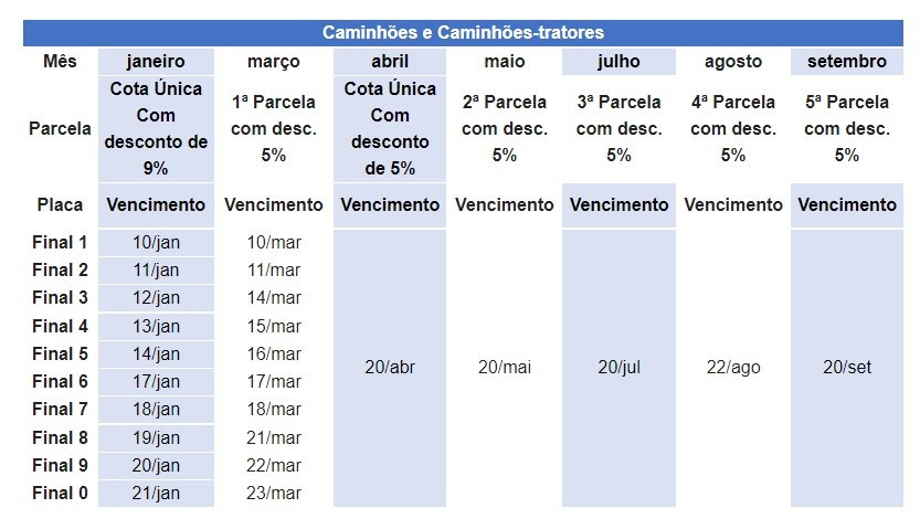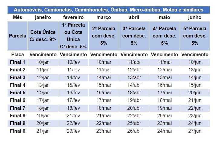 Para aproveitar o benefício, os proprietários devem ficar atentos às datas de vencimento. O calendário de vencimento de acordo com o final de placa dos veículos segue até o dia 21/1, considerando apenas os dias úteis (veja na tabela abaixo).