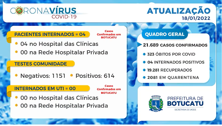 Boletim epidemiológico emitido pela Secretaria Municipal de Saúde na noite desta terça-feira, 18 de janeiro, aponta que 614 pessoas tiveram diagnósticos positivos para a Covid-19. Com isso, o total de infectados, em Botucatu, chega a 21.689 desde o início da pandemia.