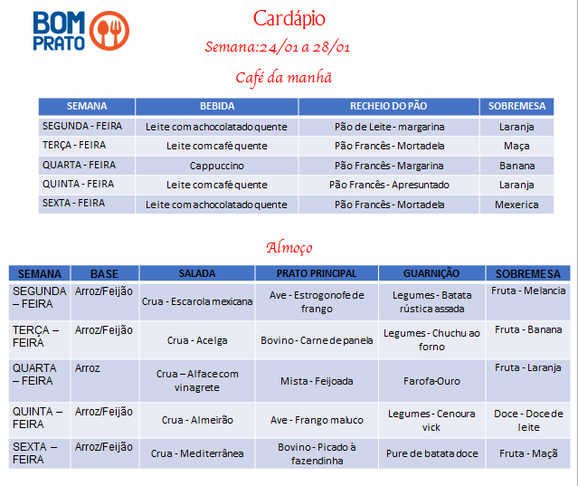 O Bom Prato Botucatu divulgou nesta segunda-feira, 24 de janeiro, o cardápio semanal do restaurante para os próximos dias úteis.