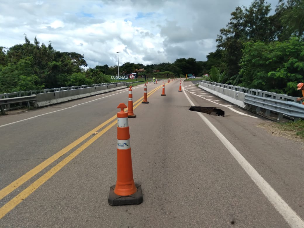 Há interdição de aproximadamente 30 metros na faixa de rolamento, em função da erosão no acostamento e pista leste. Para segurança dos usuários, a concessionária acionou a operação “Pare e Siga”.