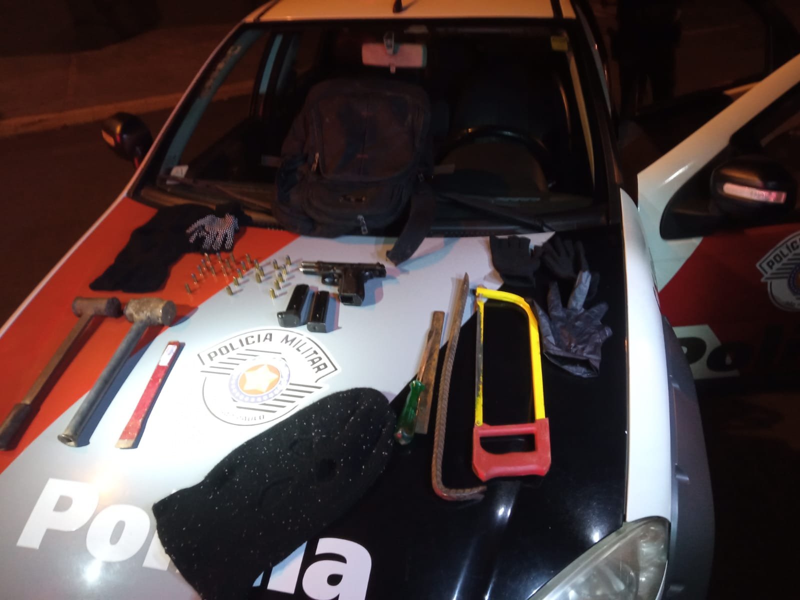 Com as informações e endereço, os policiais localizaram o terceiro integrante. Com os tres foram apreendidos objetos como ferramentas para corte de correntes, cadeados, lixas, além de toucas e uma pistola calibre 38 com munições.