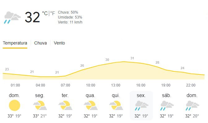 Chuva deve ocorrer a partir de sexta-feira (4), onde a probabilidade é de 50%, onde a máxima será de 32ºC e mínima de 19ºC, situação que deve ocorrer no sábado (5) e domingo (6).