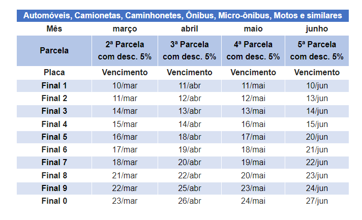 O calendário de vencimento de acordo com o final de placa dos veículos segue até o dia 23 de março, considerando apenas os dias úteis (veja na tabela abaixo). A consulta do valor do imposto pode ser feita em toda a rede bancária ou diretamente no portal da Secretaria da Fazenda e Planejamento.