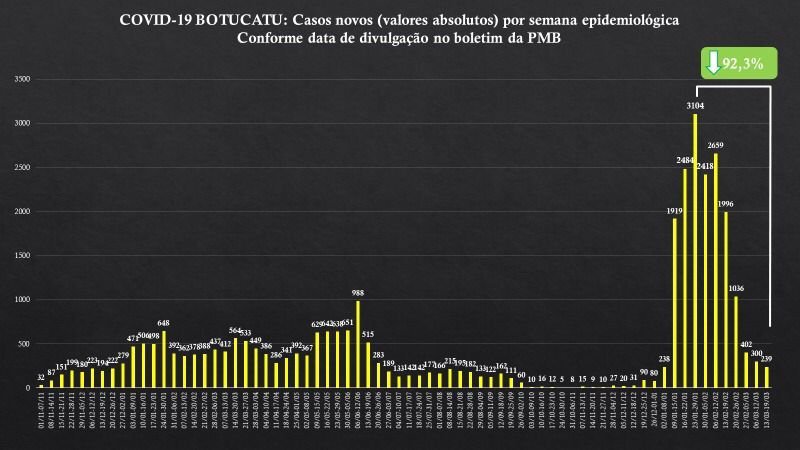 Pela quinta semana seguida, o registro de novos casos de Covid-19 tiveram redução em Botucatu, conforme apontou levantamento da Secretaria Municipal de Saúde. O acumulado de 13 a 19 de março ficou em 239 infecções, queda de 20% em comparação com o período anterior, quando foram 300 pessoas com o novo coronavírus.