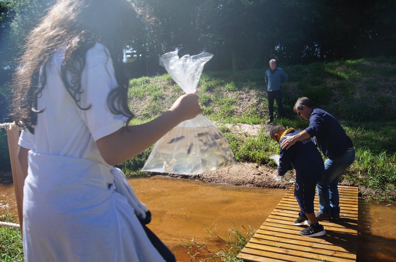 A ação, em parceria com a Secretaria Municipal de Educação, ocorreu na manha desta terça-feira e contou com a presença de aproximadamente 60 alunos da E.M.E.F. Antenor Serra, o “Serrinha”, que foram auxiliados pelos funcionários da companhia a descer nas margens do rio e despejar uma quantidade de peixes no habitat natural destes animais.