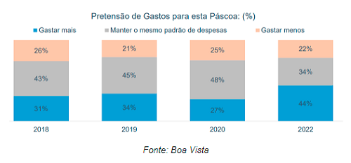 A maior parte dos consumidores que vão às compras nesta Páscoa pretende gastar mais que em 2021, de acordo com pesquisa realizada pela Boa Vista, empresa de inteligência analítica. 44% dos consumidores afirmam que os gastos esse ano serão maiores que no ano anterior. Outros 34% pretendem manter os mesmos gastos do ano passado, enquanto 22% vão gastar menos nessa Páscoa. É a primeira vez em quatro anos que a situação ocorre, conforme ilustrado no gráfico abaixo.