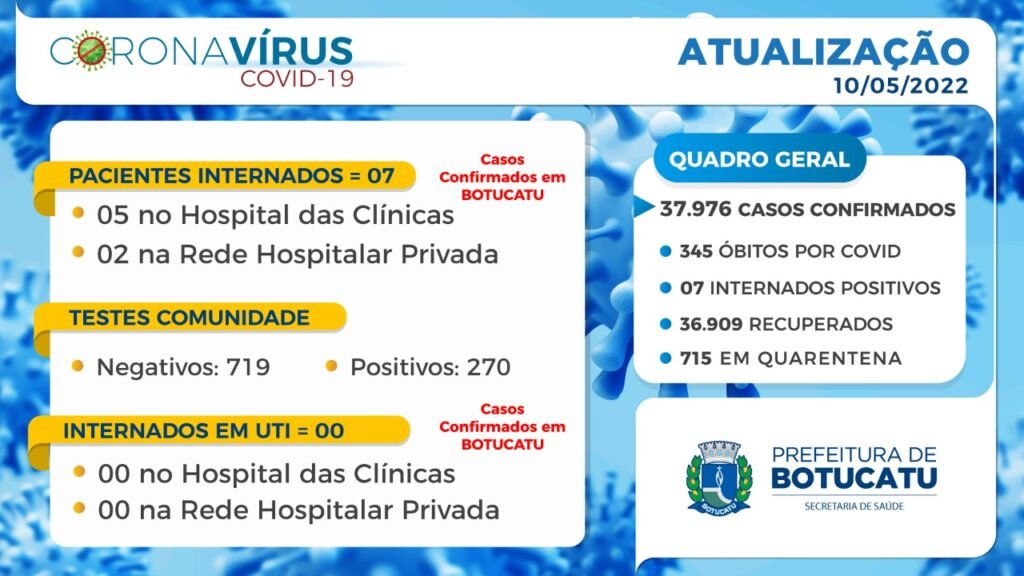 Nesta terça-feira, 10 de maio, a Secretaria Municipal de Saúde registrou 270 novos casos de Covid-19 em Botucatu. Com isso, o total chega a 37.976 infectados desde o início da pandemia.
