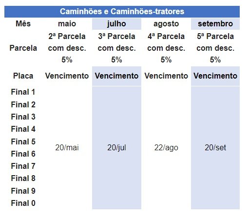 O ciclo de vencimento do IPVA 2022 para esta categoria se difere das demais. Os proprietários que parcelaram o tributo em cinco vezes e pagaram a primeira cota em março, devem pagar a segunda parcela até 20 de maio. Já os vencimentos das demais ocorrem em 20 de julho (terceira), 22 de agosto (quarta) e 20 de setembro (quinta) – veja a segunda tabela abaixo.