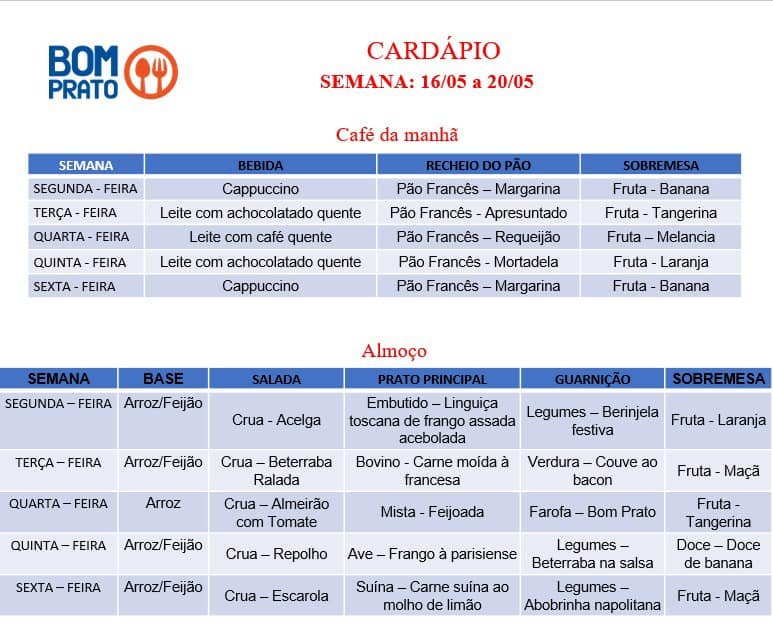 O Bom Prato Botucatu divulgou na segunda-feira, 16 de maio, o cardápio do restaurante para os próximos dias. Restaurante criado e mantido pelo governo do Estado oferece pratos a R$ 1 para atender a população de baixa renda.