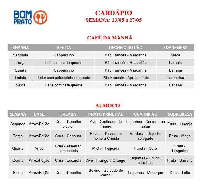O Bom Prato Botucatu divulgou na segunda-feira, 23 de maio, o cardápio do restaurante para os próximos dias. Restaurante criado e mantido pelo governo do Estado oferece pratos a R$ 1 para atender a população de baixa renda.