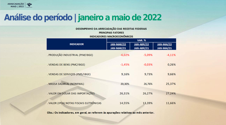Os principais indicadores traçam uma melhora da atividade econômica entre janeiro e maio deste ano, o que também ajuda a explicar a alta da arrecadação (veja na tabela abaixo). Um dos destaque foi o crescimento de 27,2% da arrecadação obtida a partir dos valores em dólares das importações, quando comparados os meses de maio de 2021 e de 2022.