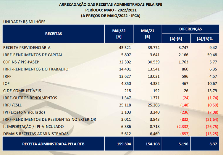 Em termos absolutos, contudo, a arrecadação com receitas previdenciárias movimentou a maior cifra: R$ 43,52 bilhões (acréscimo de 9,42% em comparação a maio de 2021). Em seguida vêm as receitas obtidas com a cobrança do Cofins/Pis-Pasep (R$ 32,30 bilhões) e IRPJ/CSLL (25,11 bilhões).