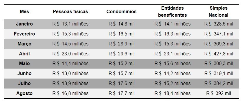 Deste montante, R$16,8 milhões são de pessoas físicas que incluíram o CPF na nota em suas compras. Outros R$18,4 milhões são destinados a instituições filantrópicas para utilização em seus projetos. A liberação dos créditos de agosto é referente às compras e doações de documentos fiscais realizadas em abril deste ano.