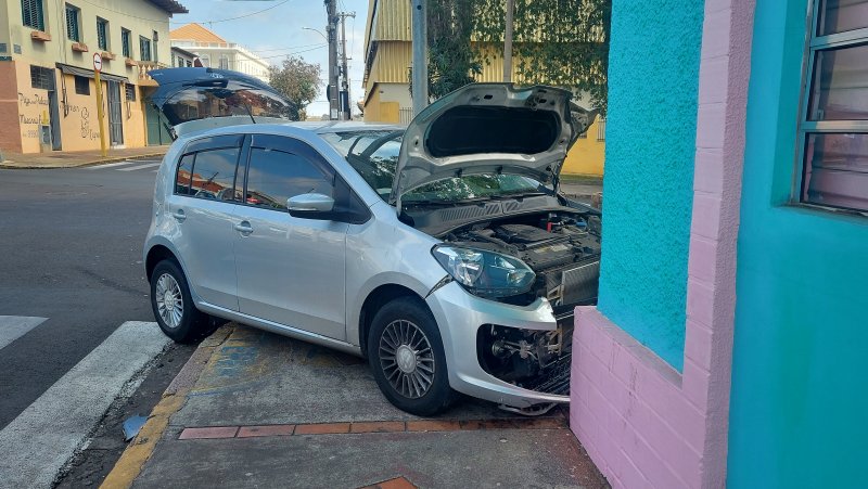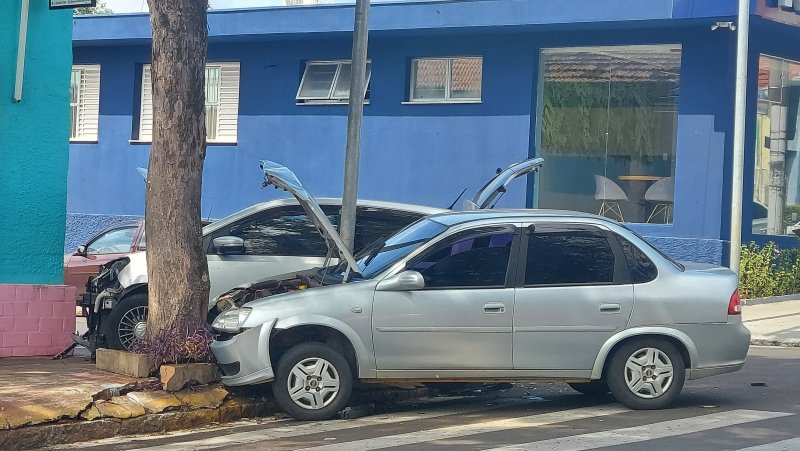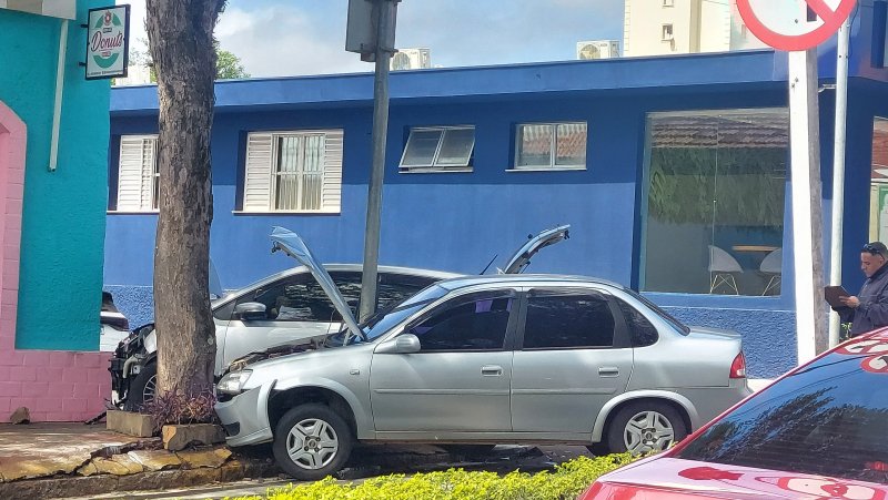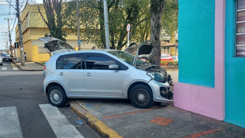 Um Chevrolet Corsa Classic chocou-se contra um Volkswagen Up!, fazendo com que ambos subissem a calçada e, por poucos metros, não atingem uma loja no local.
