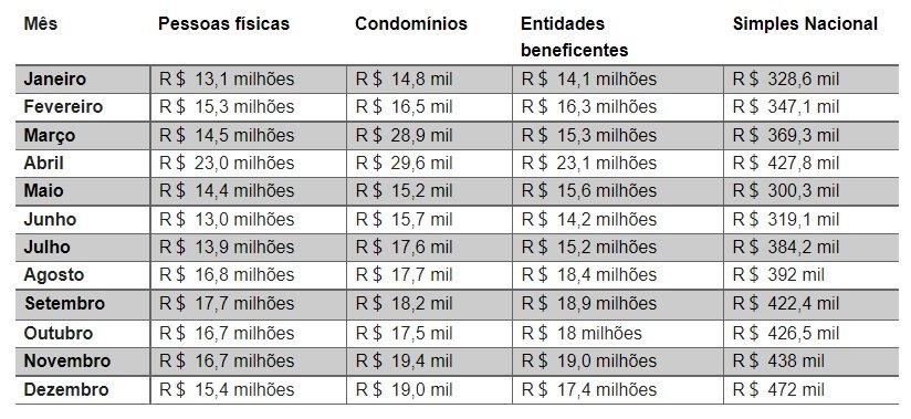 Desse total, R$ 15,4 milhões serão creditados para as Pessoas Físicas que estão cadastradas no Programa e solicitaram a inclusão de seu CPF nas notas fiscais nas suas compras. Outros R$ 17,4 milhões serão liberados para as entidades beneficentes de todo o Estado, que poderão utilizar esses recursos para investimentos e melhorias de suas atividades. Já para as Pessoas Jurídicas, optantes pelo Simples Nacional, foram liberados mais de R$ 472 mil em créditos. E os Condomínios cadastrados, receberão mais de R$ 19 mil.