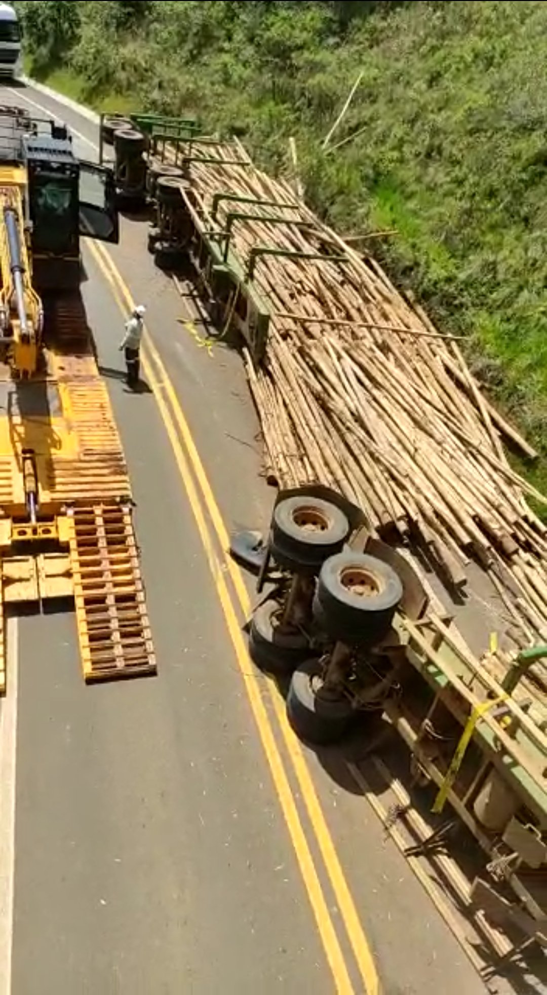 Motorista da carreta que transportava madeira, perdeu o controle do veículo