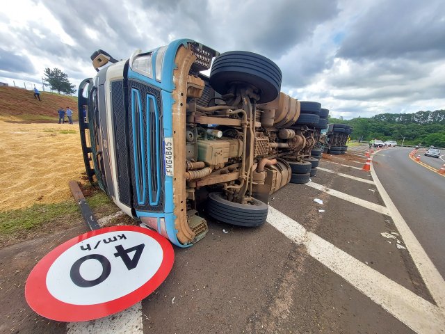 A carreta tombou lateralmente, vindo a arrancar quatro placas de sinalização. Toda a carga ficou espalhada no canteiro e ocupou toda a pista do acesso da Rodovia Gastão Dal Farra à Rondon.