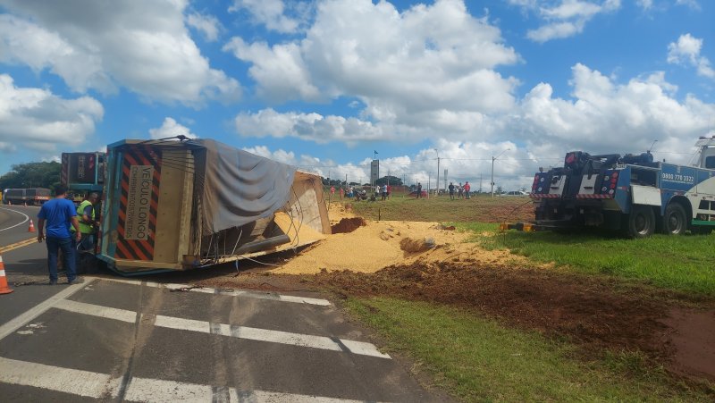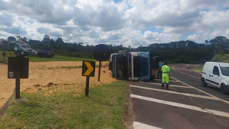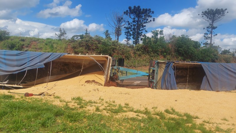 Uma carreta carregada com milho tombou na tarde desta sexta-feira, 30 de dezembro, na Rodovia Marechal Rondon (SP 300), em Botucatu.