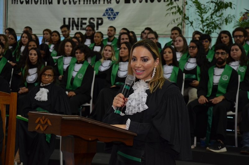 O discurso seguinte foi feito pela oradora da 55ª Turma de Medicina Veterinária, Silmara Rodrigues dos Santos, que lembrou a trajetória do grupo de formandos. “Desde o começo lidamos com várias transformações e adaptações. Para a maioria Botucatu era uma cidade nova onde não conhecíamos nada nem ninguém. Com a distância da família e dos amigos, saímos totalmente de uma zona de conforto para mergulhar numa nova etapa da vida. Esse é apenas o início de uma jornada de sucesso e conquistas. Por fim, além dos agradecimentos que devemos aos nossos pais, amigos, professores, à FMVZ, à Unesp e a todos que colaboraram para que estivéssemos aqui hoje, eu gostaria de agradecer a cada um de vocês formandos. Cada um é incrível à sua maneira. São todos dignos dessa conquista e de toda a felicidade que o universo venha a oferecer”. Silmara também dedicou parte de seu discurso para homenagear a memória da colega Carolina Teixeira Dias, falecida no ano passado.