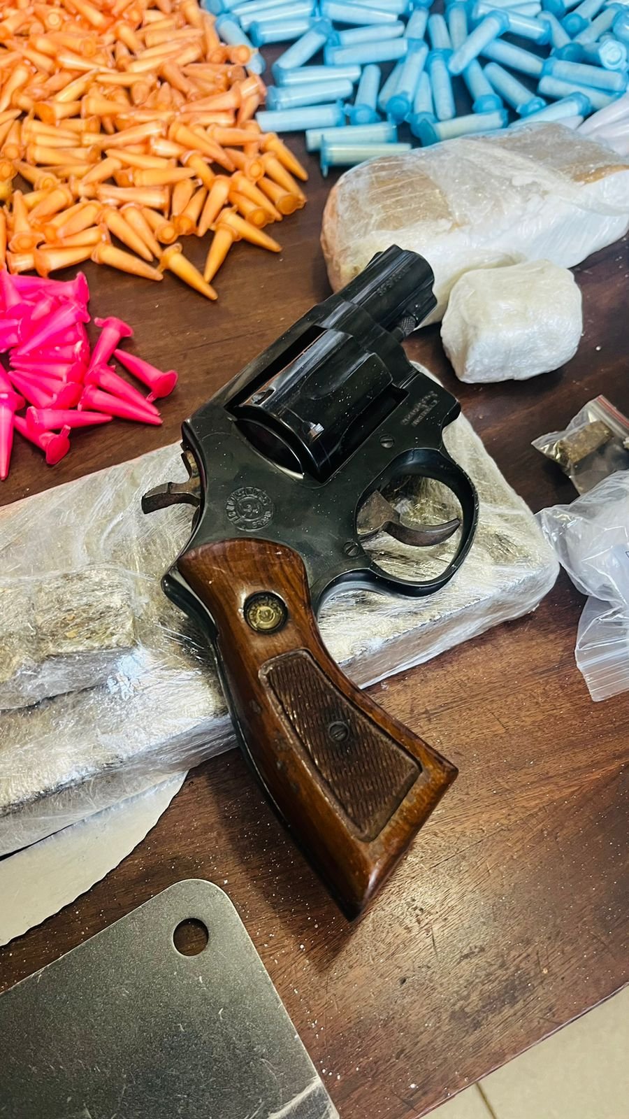 Dentro da residência os policiais encontraram 1890 porções de cocaína escondidas em uma mochila. Também foram apreendidos tijolo de maconha, além de uma arma calibre 38 e uma machadinha. Com a acusada ainda estava um caderno de anotações sobre a venda do tráfico e um telefone celular.