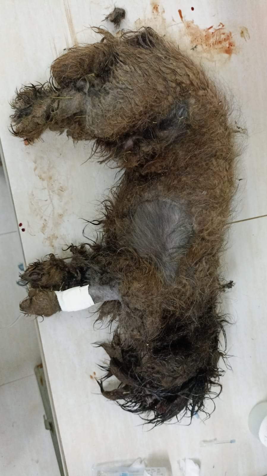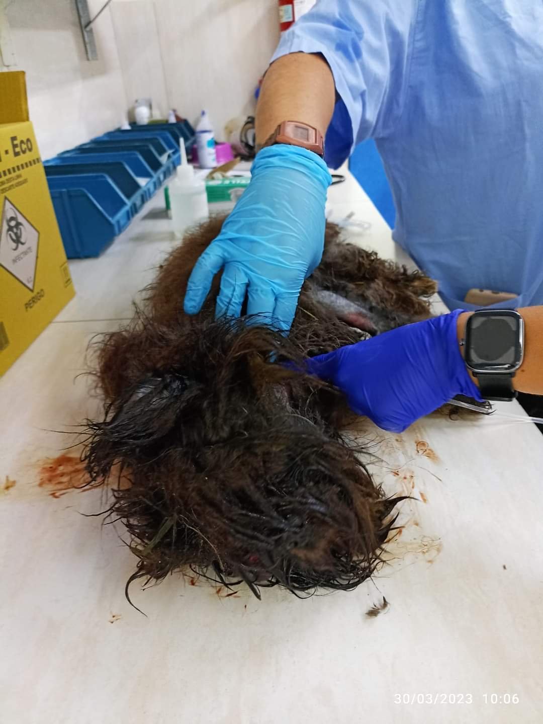 Os veterinários constataram que o cachorro estava com um dos olhos deslocado para frente (fora da órbita), com muitas larvas de moscas no local e extremamente debilitado. O animal está internado e segue sob cuidados.