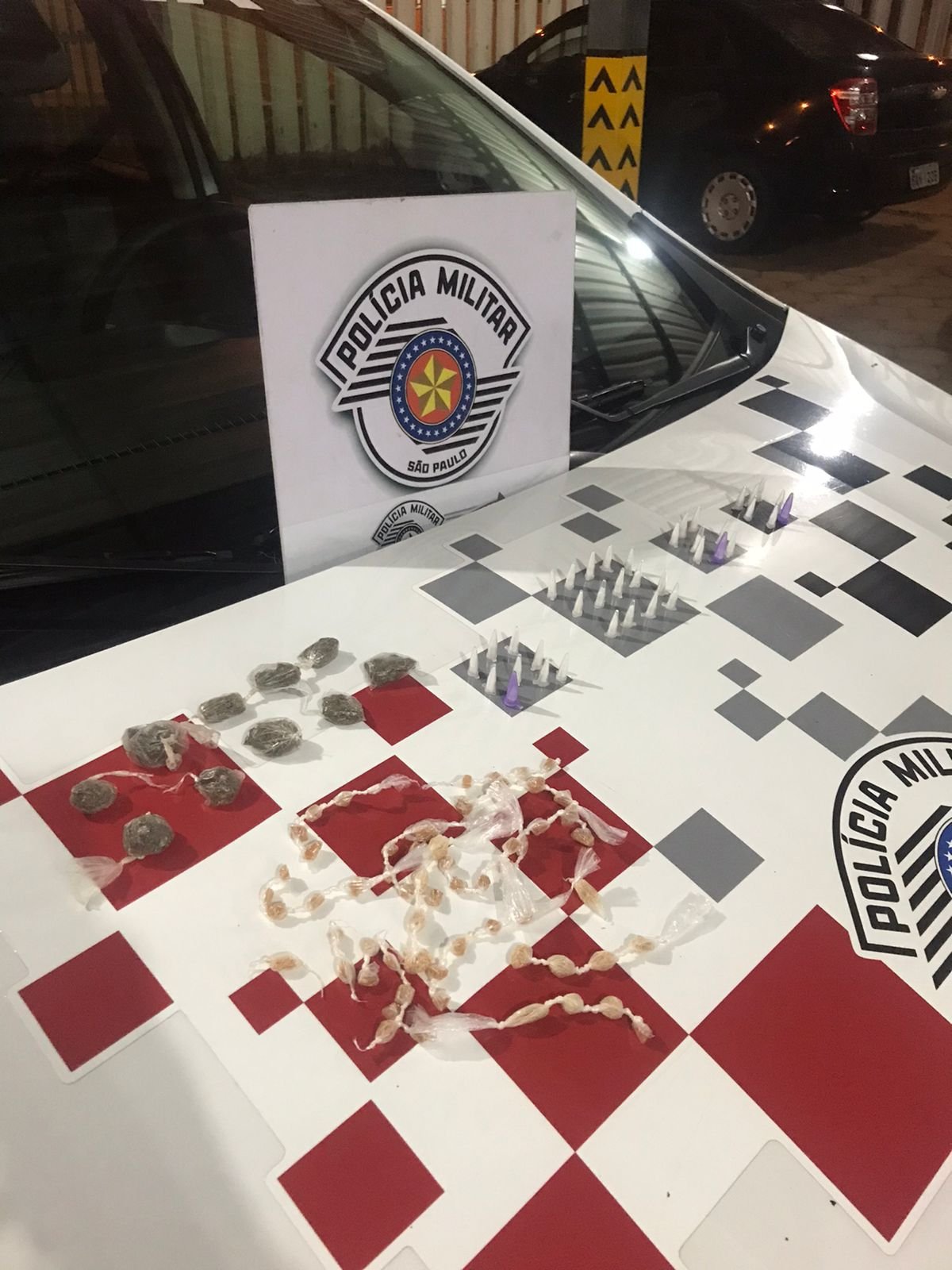 No interior do Monza estava uma sacola plástica contendo dez porções de maconha, 38 de cocaína e 60 pedras de crack.