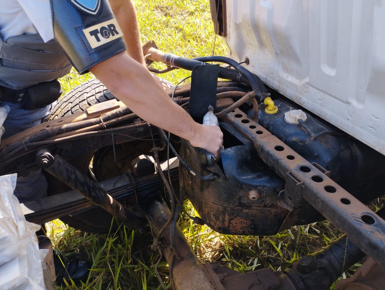 Houve revista na caminhonete quando um dos policiais verificou uma soldagem no tanque de combustível e remendos no estepe. No interior de ambos estavam 64,800 quilos de cocaína em 57 tabletes.