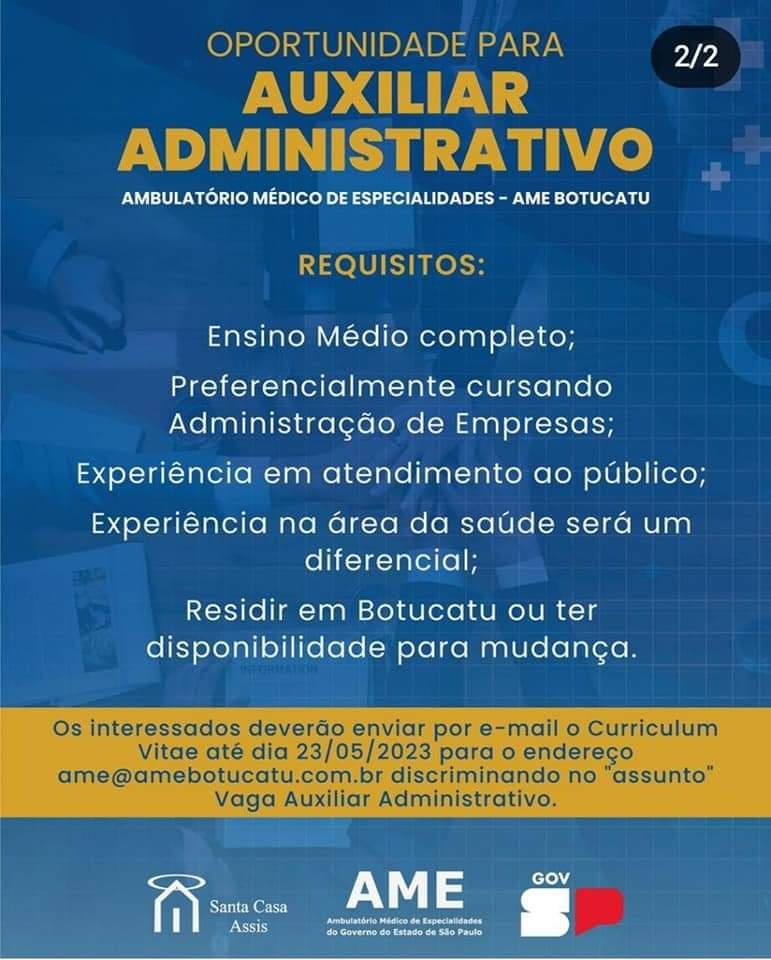 Outro cargo é para auxiliar administrativo. As exigências são ensino médio completo, preferencialmente cursar administração de empresas, experiência em atendimento ao público, experiência na área da saúde. Residir em Botucatu ou possibilidade de mudança de cidade.