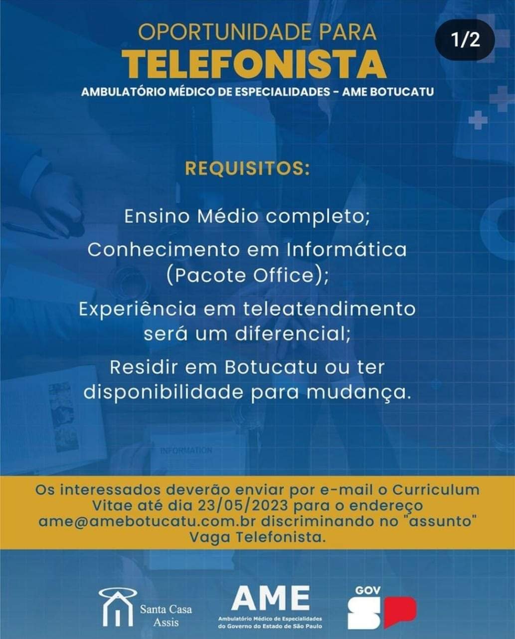 A primeira oportunidade é para telefonista. As exigências são ensino médio completo, conhecimento em informática (pacote Office), experiência em teleatendimento será diferencial, bem como residir em Botucatu ou possibilidade de mudança de cidade.