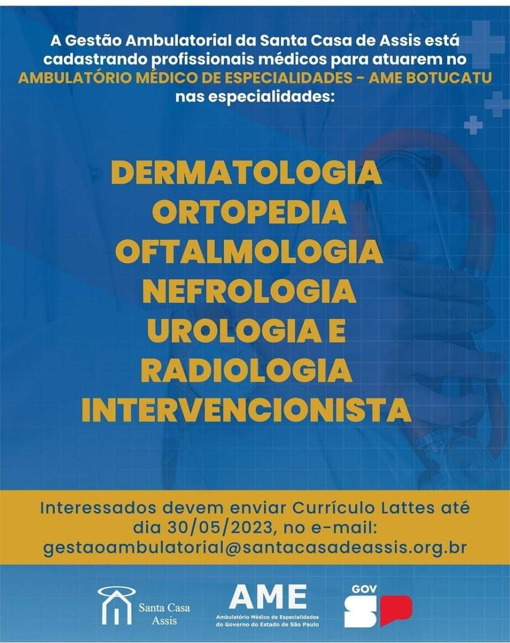 O Ambulatório Médico de Especialidades de Botucatu (AME), sob gestão da Santa Casa de Assis, está com vagas em aberto para funções administrativas e cadastro de médicos.