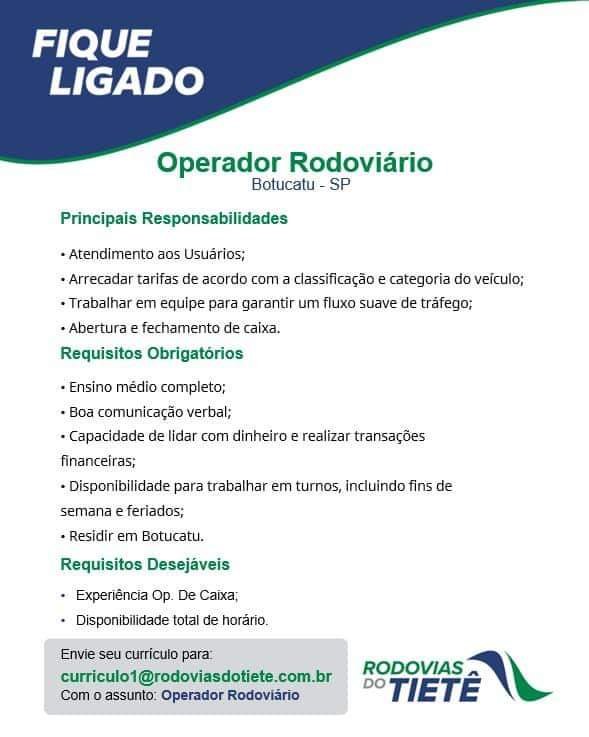 A Rodovias do Tietê, concessionária responsável pela gestão da malha viária na região de Botucatu está com vaga de trabalho em aberto.